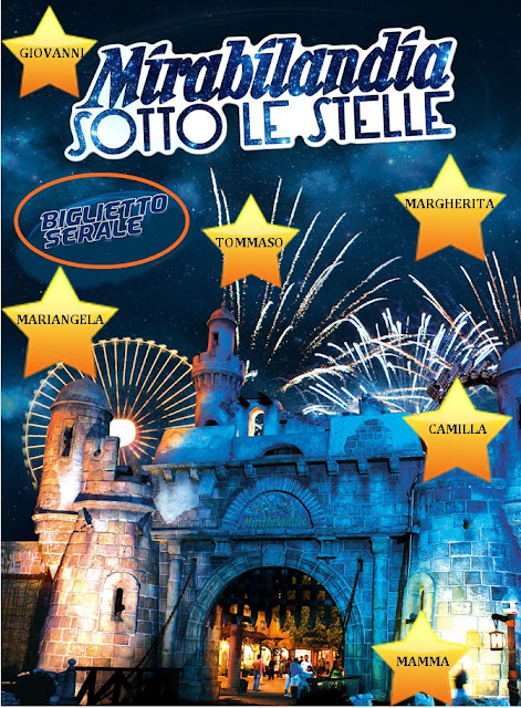 Quando ci siamo svegliati la mamma ci ha dato il regalino finale, il premio di coraggio; io non avevo proprio idea di cosa potesse essere, un po’, però, pensavo che fosse un Lego, invece era un biglietto  per Mirabilandia sotto le stelle, così si può andare sia sulle giostre, sia vedere uno spettacolo di macchine.